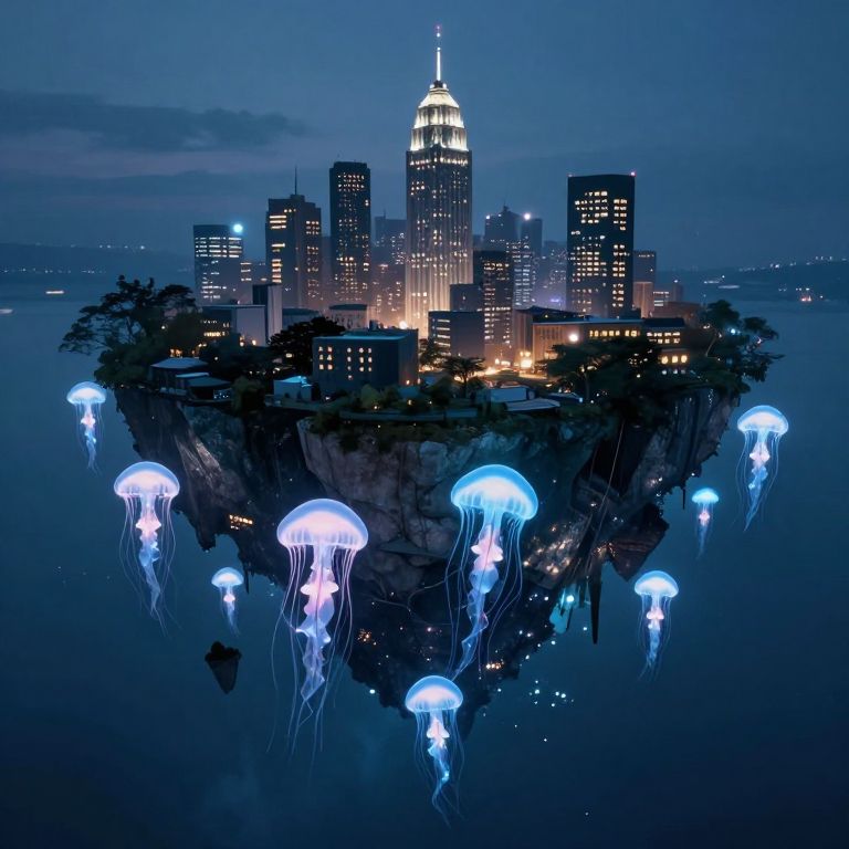 A luminous city perched atop a floating island defies gravity, suspended gracefully by a mesmerizing swarm of bioluminescent jellyfish whose ethereal glow illuminates the serene, otherworldly depths below.