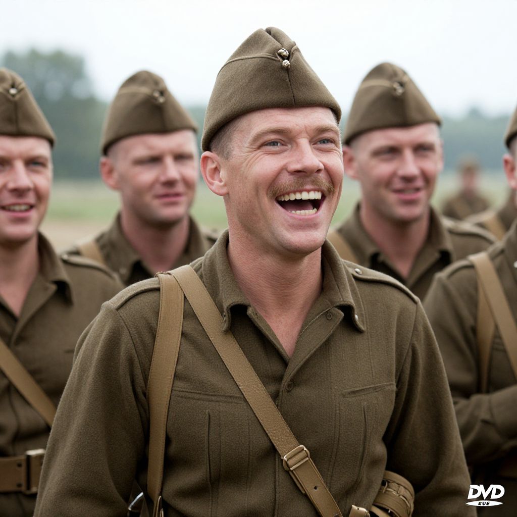 In the image, a man dressed as a World War One captain, played by Robert Pires, is captured in a moment of joyous laughter. He is adorned in a khaki uniform with a cap, exuding a sense of camaraderie and shared experience with his fellow soldiers. The captain's mustache adds a touch of character and authenticity to his portrayal. Surrounding him are other soldiers, all dressed in similar uniforms, creating a sense of unity and shared purpose. The background is slightly blurred, drawing focus to the captain's face and the group of soldiers behind him. The overall composition suggests a scene from an 80s cinema, as indicated by the DVD screengrab watermark, capturing a moment of levity and human connection amidst the backdrop of war.