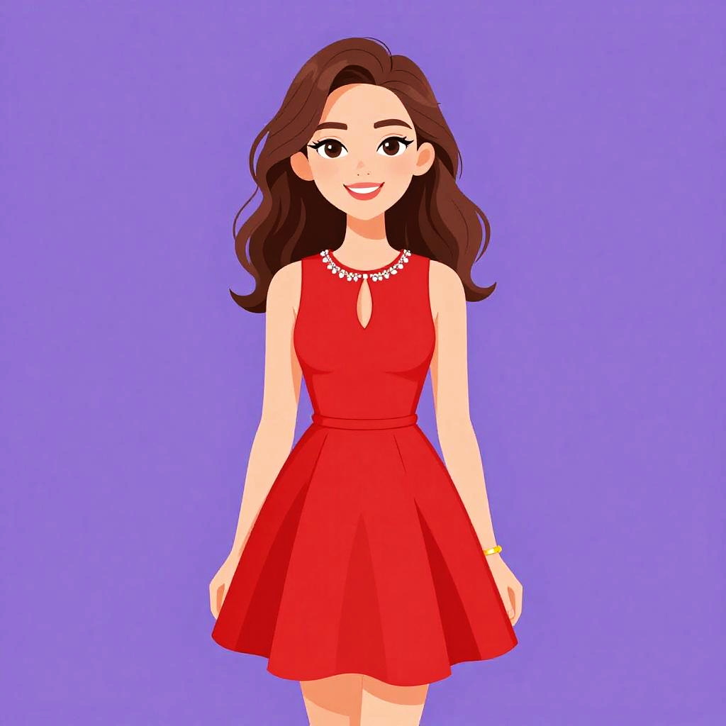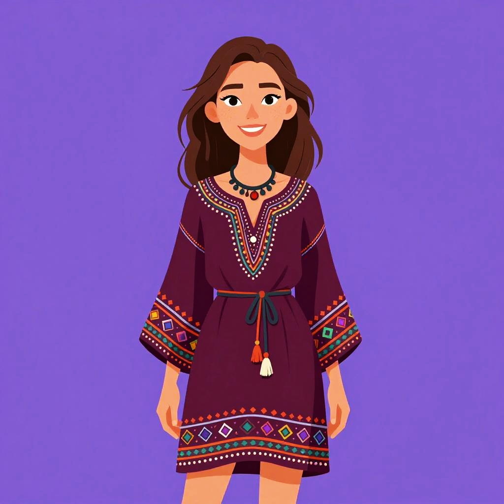 Woman with pretty face and pretty hair. smiling Woman, bohemian style, loose-fitting dress in deep burgundy with intricate multicolored patterns, round neckline, long bishop sleeves, tassel tie waist, above-knee length, straight hem, paired with a chunky tribal-inspired necklace. --sref 1467