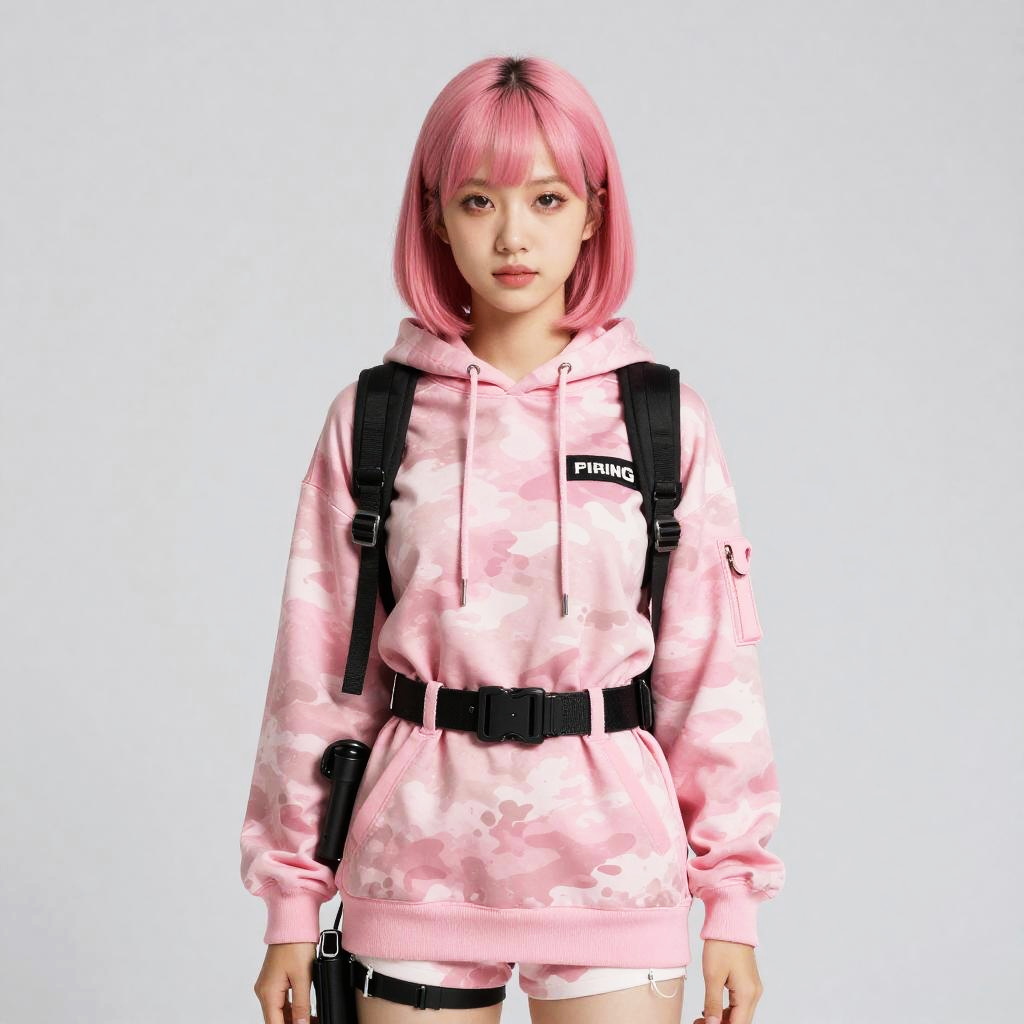 Pink Camo Army Costume Girl, woman with pink hair and a pink hoodie