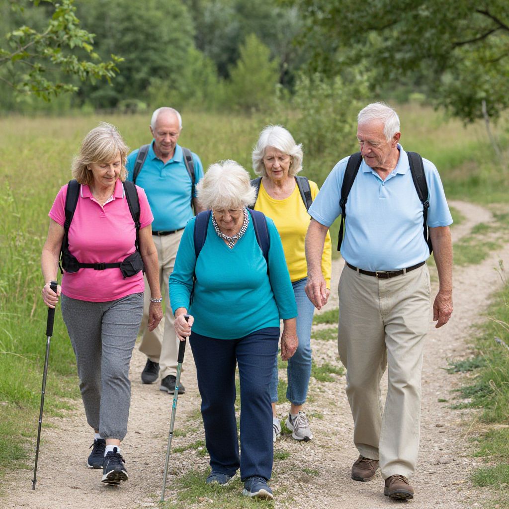 Photograph of five elderly adults walking on a dirt path in a green, wooded area. They wear casual clothes, backpacks, and use walking sticks