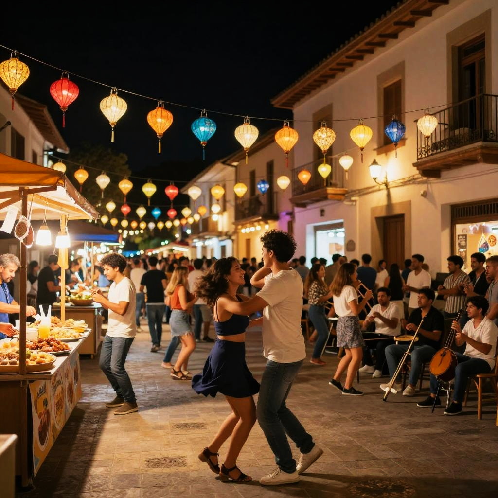 Adria night street festival, lively crowd dancing and celebrating under strings of colorful lanterns, food stalls with local delicacies, musicians playing traditional instruments, historic buildings illuminated by warm lights, festive and joyful ambiance in the heart of the town