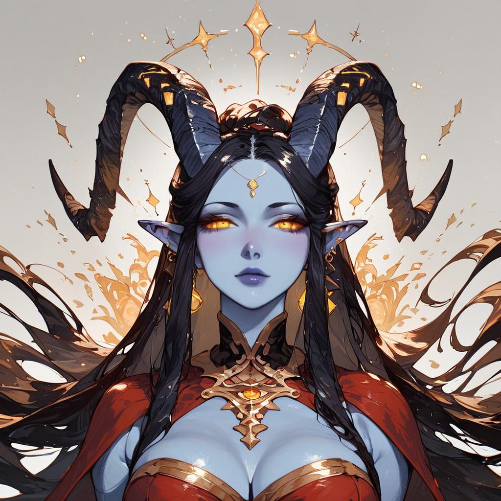 Score_9, score_8_up, score_7_up, source_anime 1girl, solo, horns, pointy ears, colored sclera, colored skin, tail, tail ornament, armor, parted lips, midriff, navel, standing, magic circle, aura, glowing body marks, forehead mark