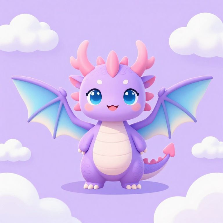The image features an adorable, kawaii-style dragon with a pastel color palette. The dragon has large, expressive blue eyes and a gentle, smiling expression. Its body is primarily light purple with white underbelly and pink accents on its wings and horns. The dragon's wings are spread out, revealing a gradient of blue and white scales, and its tail is adorned with sharp, jagged spikes. The background is a soft, pastel purple with fluffy white clouds, creating a dreamy, whimsical atmosphere. The overall composition is balanced, with the dragon centrally positioned and the clouds framing it, giving the image a sense of depth and space. The dragon's small size and cute features make it perfect for a t-shirt design, evoking a sense of playfulness and fantasy.