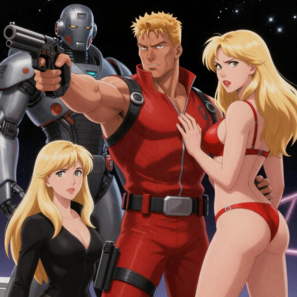 Comic-style drawing of four people in a sci-fi setting. Center: muscular man with blonde hair, red suit, pointing gun. Right: blonde woman with long hair, red lingerie, hand on his arm. Bottom left: blonde woman with long hair, black outfit. Background: armored robot, space background with stars. Man's intense expression, women's concerned expressions.