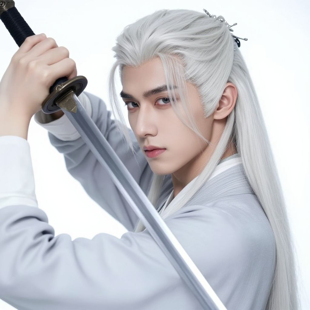 (masterpiece:1.2), best quality, Chinese style, solo, 1boy, male focus, long hair, looking at viewer, parted lips, holding, upper body, from side, profile, sword, bangs, weapon, white hair, jewelry, white background, water, grey hair, simple background, grey eyes, hair between eyes, long sleeves