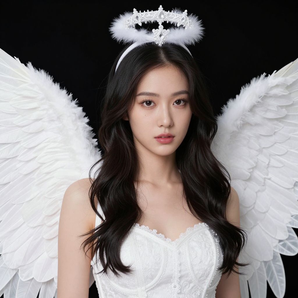 White Angel Black Angel Costume, a close up of a woman wearing a crown and angel wings