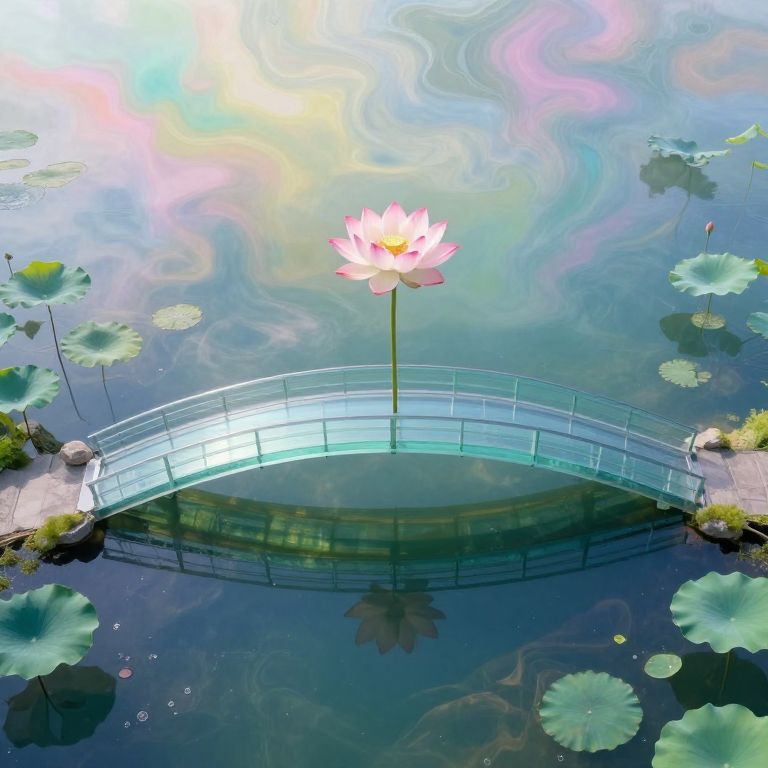 Imagine an enchanting, impressionistic landscape where dreamlike elements intertwine with nature's beauty. A graceful glass bridge arches over a tranquil pond, its structure nearly invisible beneath the shimmering water. In the center of this ethereal span, a blooming lotus flower reaches for the sky, symbolizing purity and enlightenment. From an aerial perspective above the surface, soft, swirling colors blend seamlessly together, creating a mesmerizing scene that evokes feelings of tranquility, wonder, and introspection as viewers immerse themselves in this captivating fusion of surrealism and natural splendor.