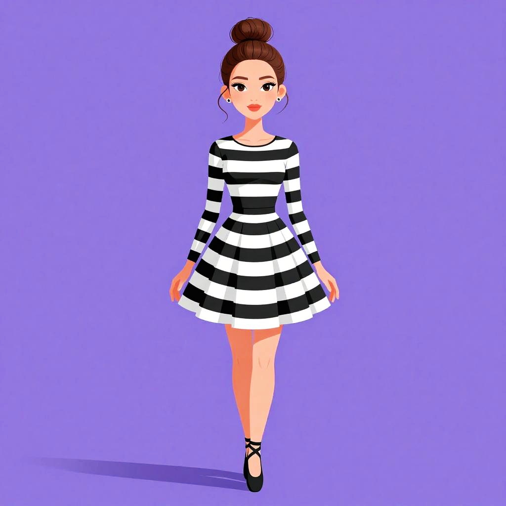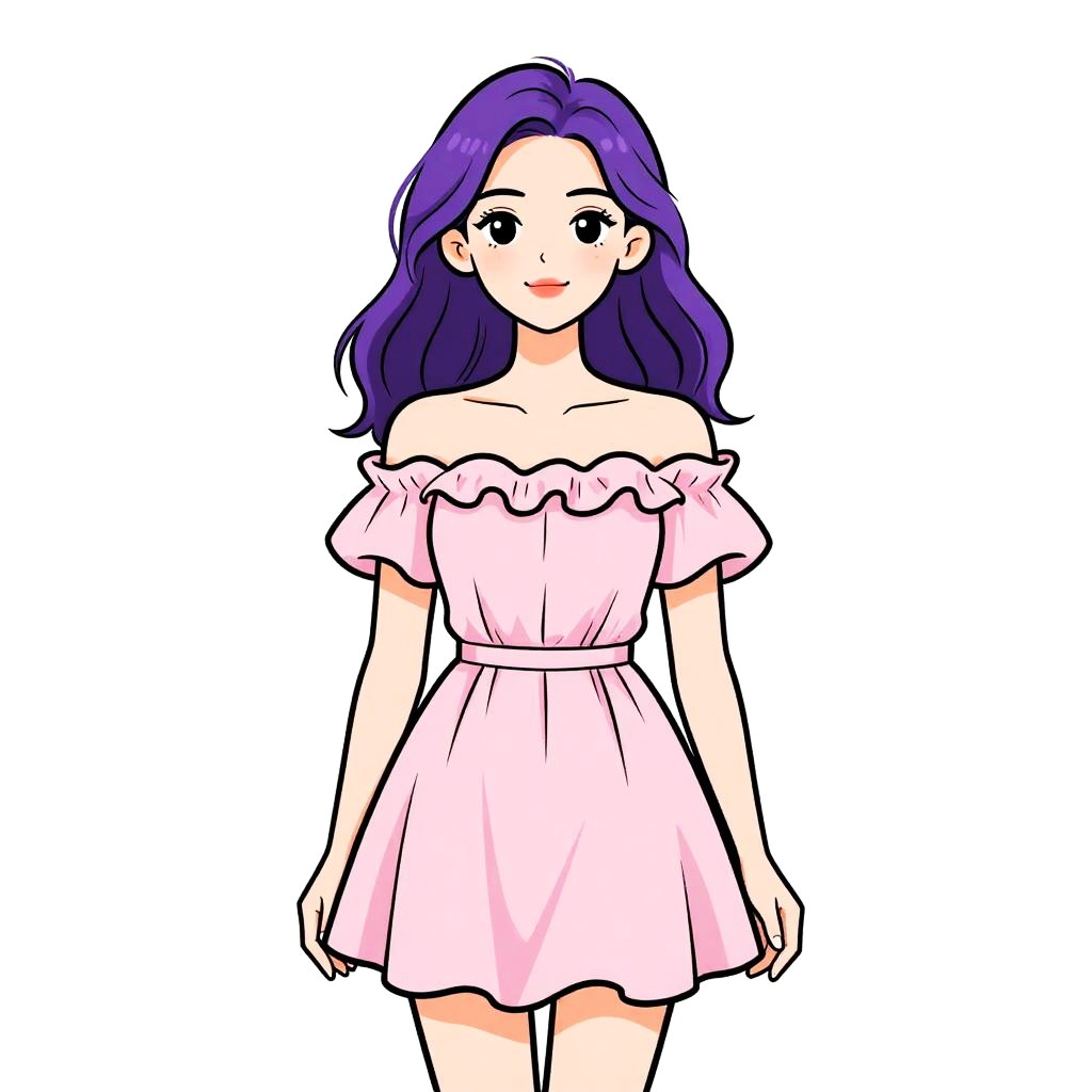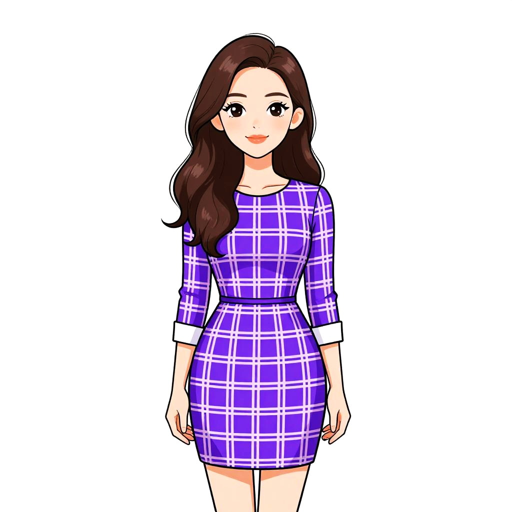 Woman with pretty face and pretty hair. Woman, preppy style, plaid patterned mini dress in purple and white, round neckline, three-quarter length sleeves with white cuffs, fitted waist with gathered skirt, above-knee length, plain white studio background --sref 1461