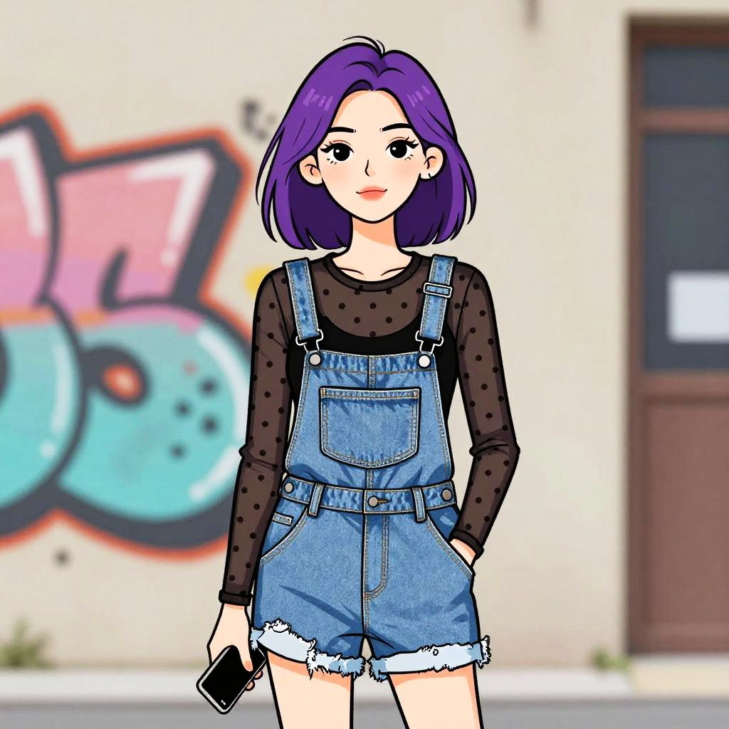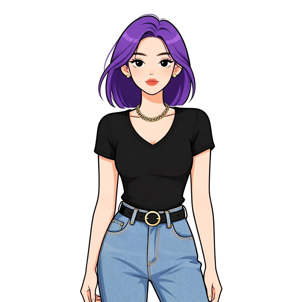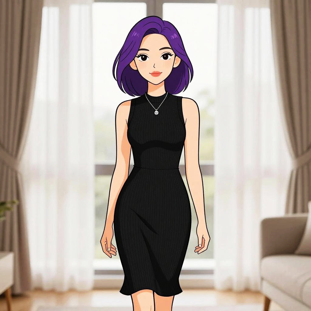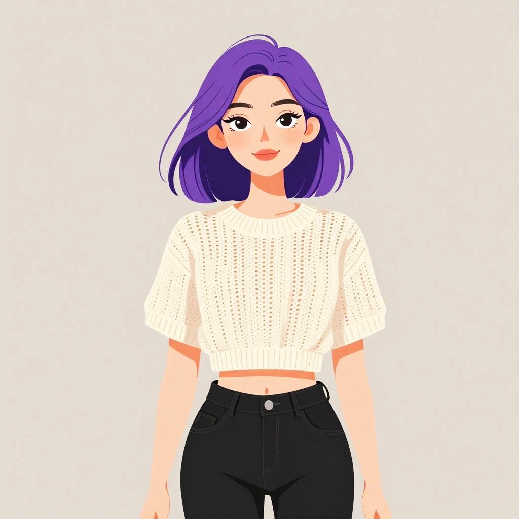 Woman with pretty face and pretty hair. Woman, preppy style, plaid patterned mini dress in purple and white, round neckline, three-quarter length sleeves with white cuffs, fitted waist with gathered skirt, above-knee length, plain white studio background --sref 1461