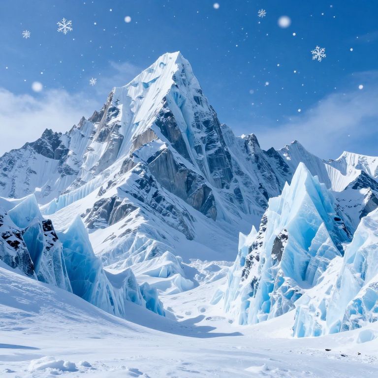 A frozen symphony of serenity and wonder, where jagged peaks of ice hum with the echoes of forgotten dreams, and snowflakes drift like whispers of hope against a boundless sky.