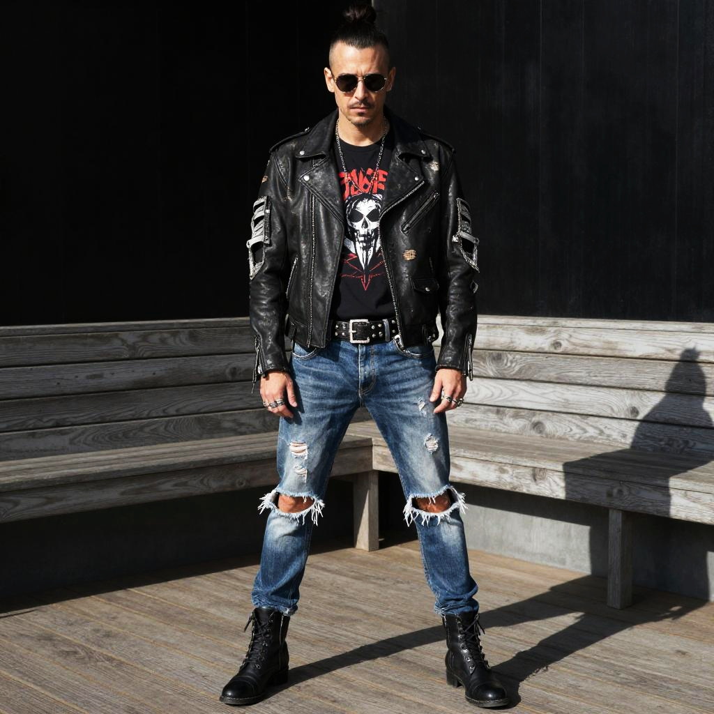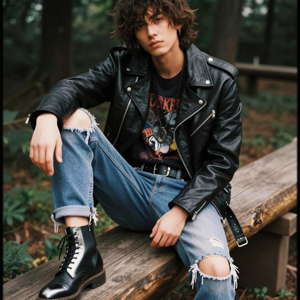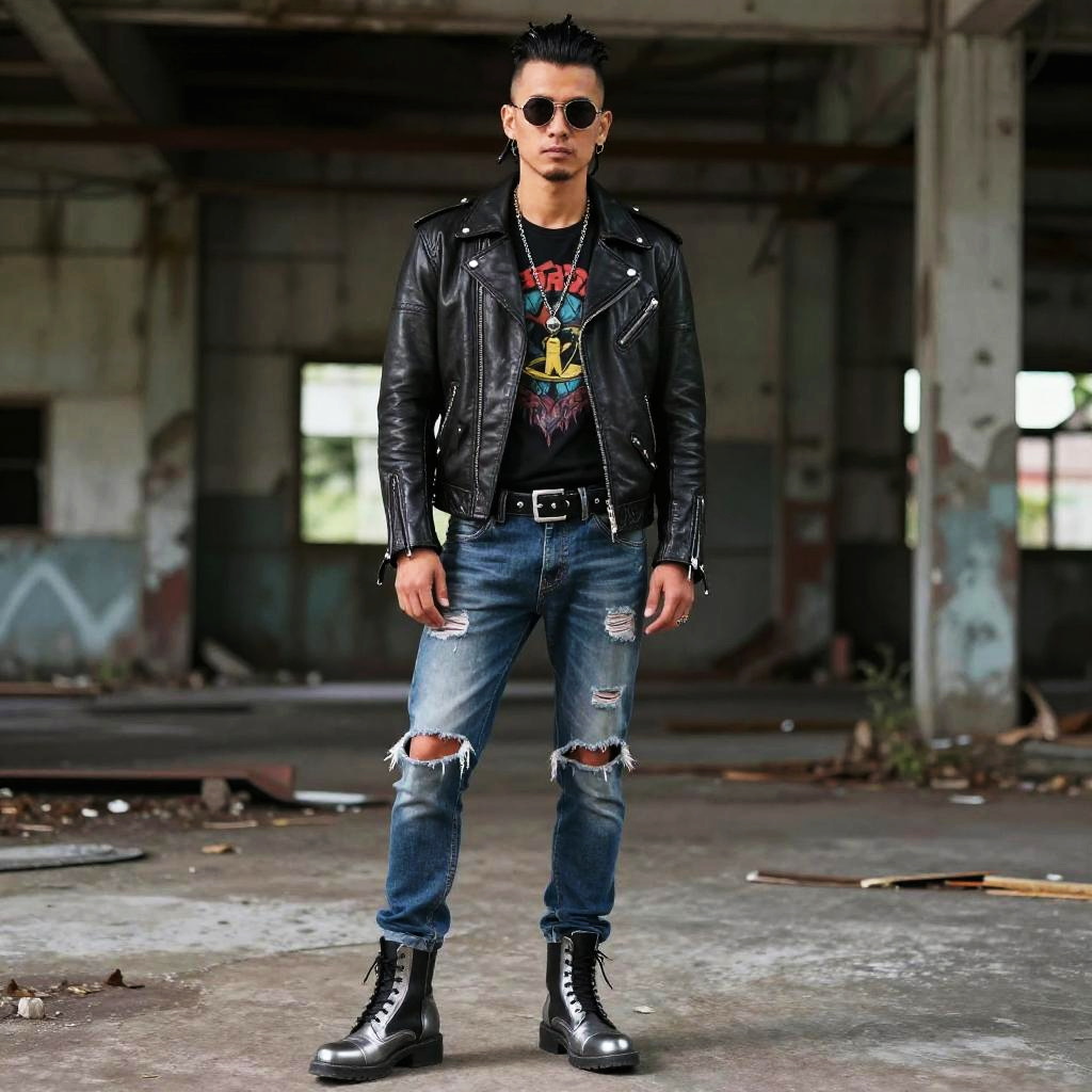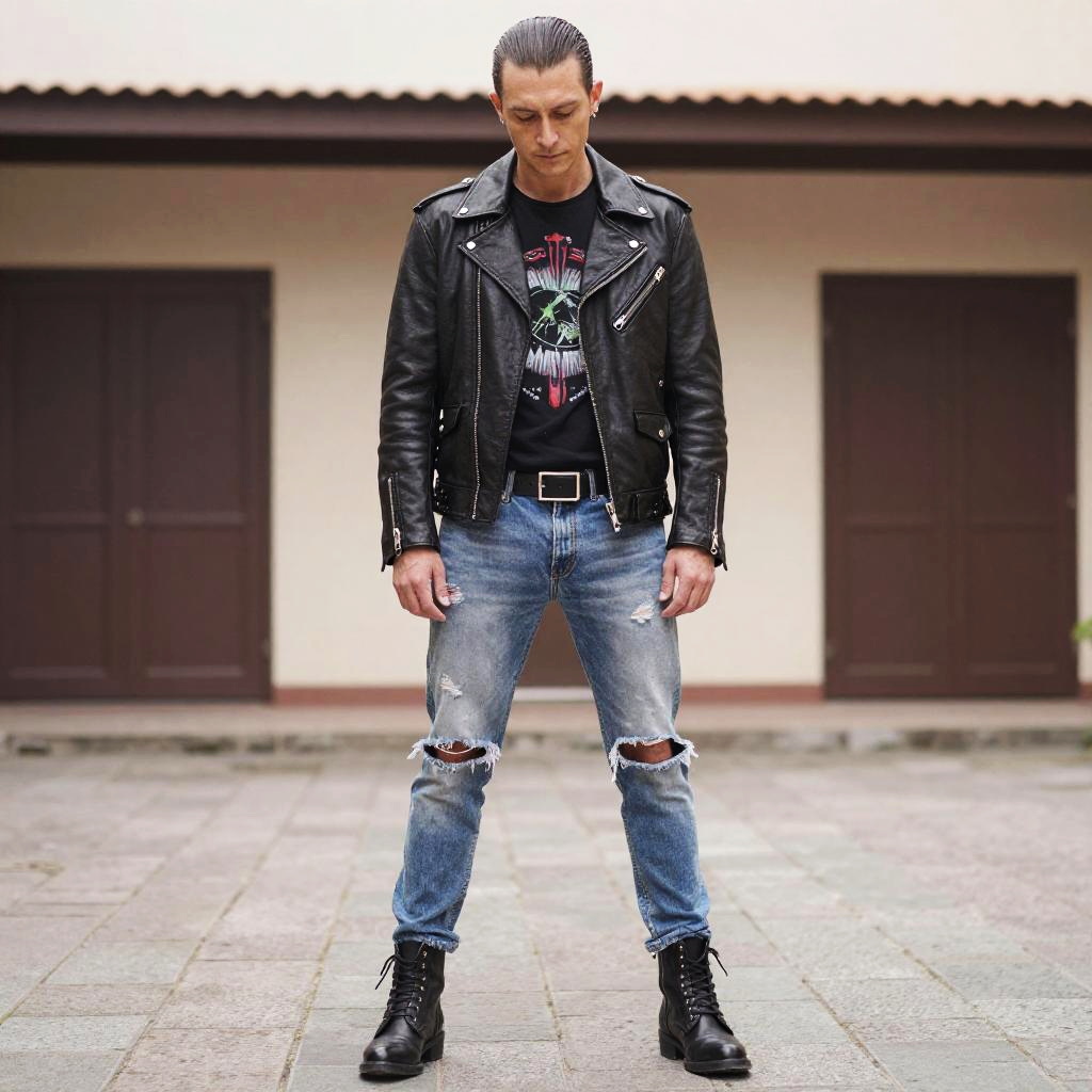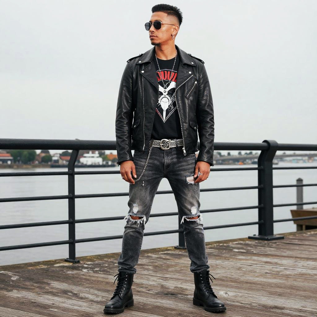 Photo of a Prominent Collarbone man, Man Bun, concert outfit ideas, leather jacket with distressed leather, graphic t-shirt, ripped jeans, ankle boots, black and silver, edgy, rock style, casual, bold accessories, studded belt, urban vibe, Deck with seating, cross-hatching shadows