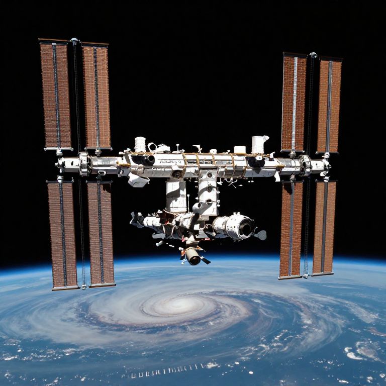 Photograph of the International Space Station (ISS) orbiting Earth. The ISS is centered, connected to two large, cylindrical solar arrays on either side. The station's white, modular structure contrasts against the blackness of space. Below, a swirling white and blue hurricane is visible over the blue expanse of Earth's atmosphere. The solar arrays have a reddish-brown hue with metallic textures. The background showcases the deep black void of space, emphasizing the ISS and Earth's curvature. The image captures the intricate details and scale of the ISS against the vastness of space and Earth's surface.