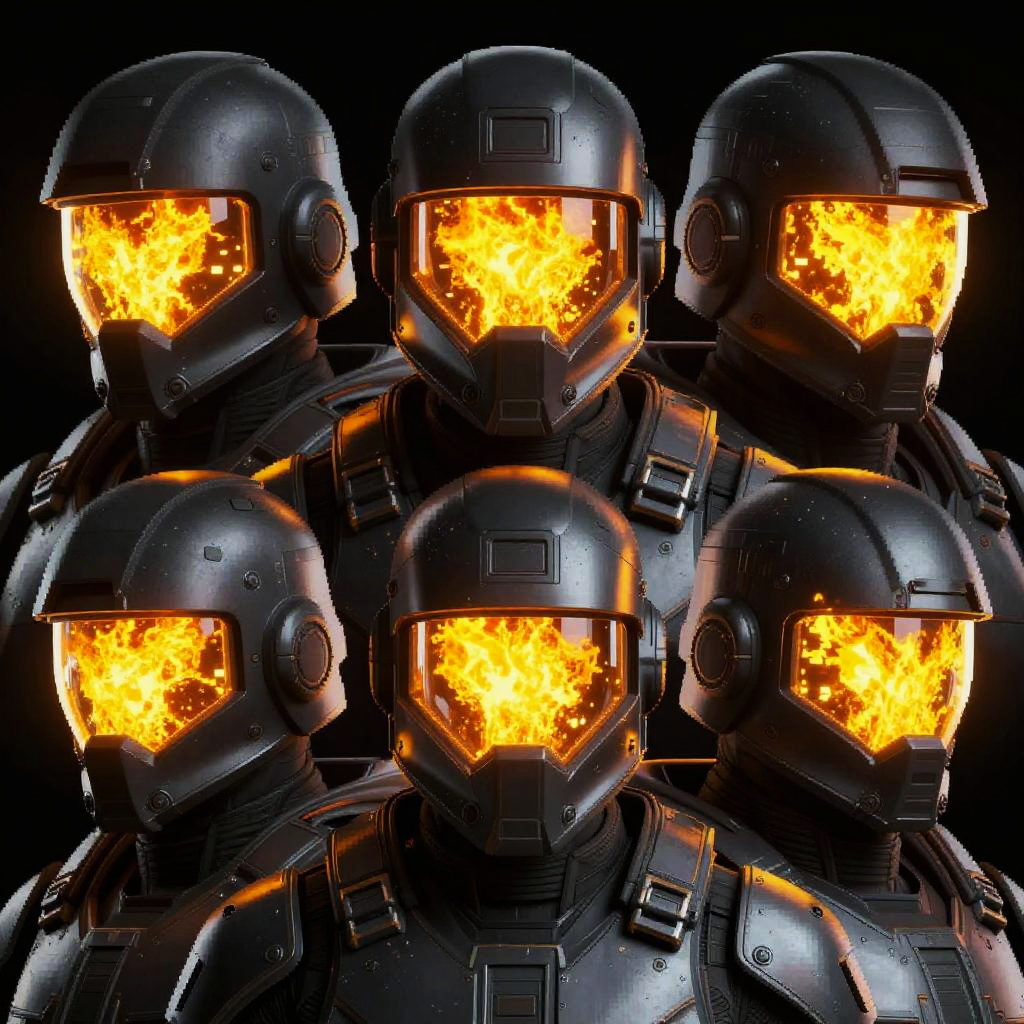 This image is a digital artwork showing four close-up portraits of a sci-fi soldier in a black helmet with a glowing, fiery yellow-orange visor. The soldier's face is mostly obscured by the visor, and he wears dark, reflective armor. The background is solid black, making the glowing visor stand out. The artwork has a pixelated, digital style with bright highlights and shadow contrasts.