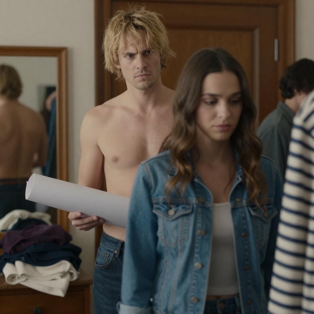 Photograph of three people in a dilapidated room. Man with shaggy blonde hair, shirtless, aiming gun from bed. Woman with wavy brown hair, light brown shirt, seated in background. Another man with blonde hair, shirt, lying on bed. Metal bed frames, white sheets, and gray walls. Intense expressions on faces.