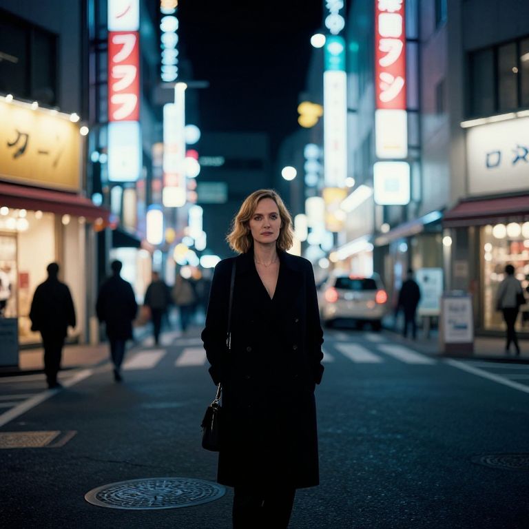 Photograph of a blonde woman with wavy hair, wearing a black coat and holding a black handbag, standing confidently in the middle of a brightly lit, narrow urban street at night. Neon signs in Japanese characters in red, white, and blue illuminate the background, creating a vibrant, bustling atmosphere. The street is lined with shops, and a few pedestrians are visible in the distance. The woman stands in the foreground, slightly off-center, with a calm expression. The image has a high contrast and a slightly moody, cinematic feel.