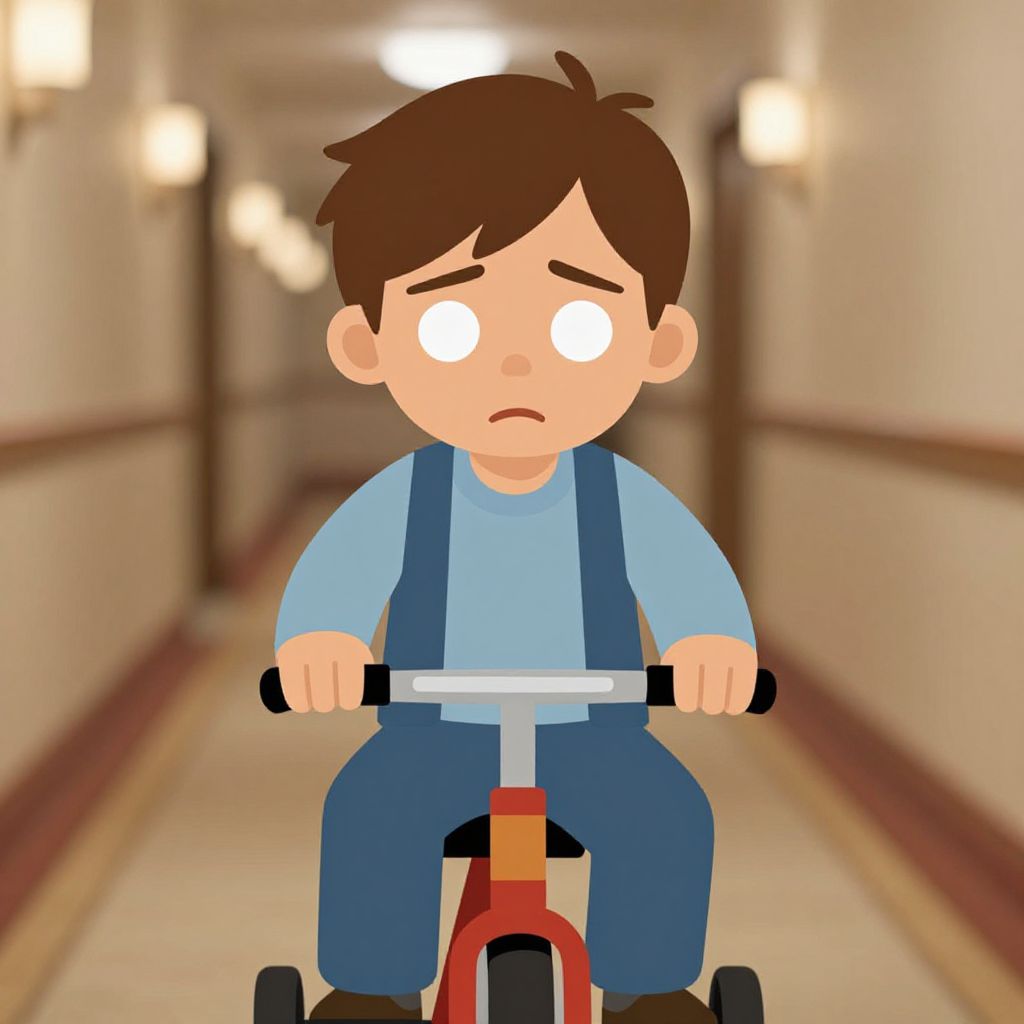 Lucid close up view of a vector clipart of Danny, the kid from horror film The Shining, riding his tricycle along the hotel hallway. Dannys eyes are white, his facial expression is bored.,