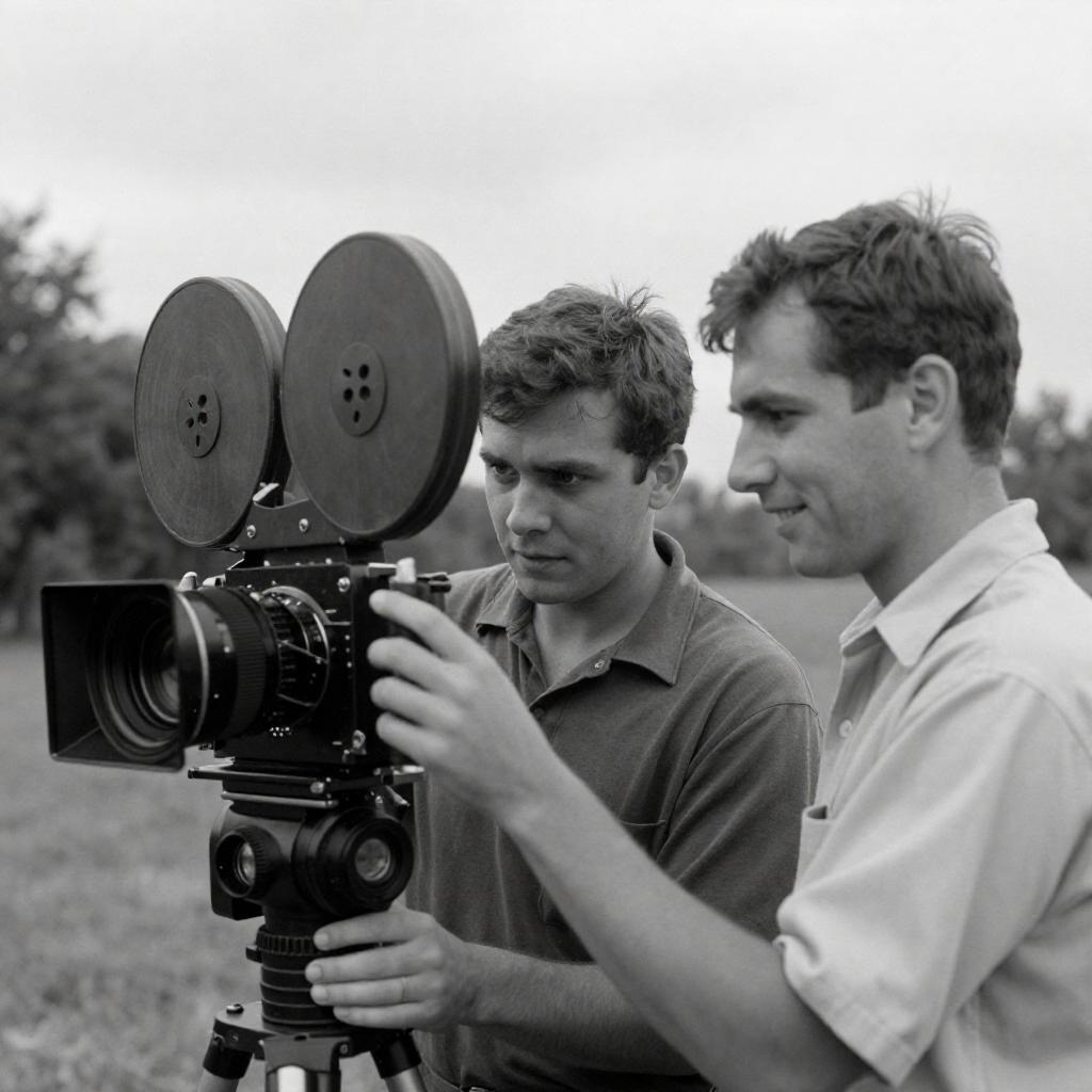 Black-and-white photograph of two men, one operating a large film camera with a large lens, the other observing. Both have short, dark hair. Background includes trees and a cloudy sky. The man operating the camera has a concentrated expression, the other man appears slightly amused. Both men are wearing collared shirts.
