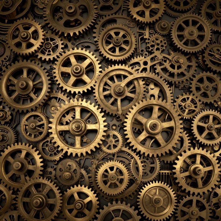An endless expanse of intricately detailed gears and wheels, rendered in a steampunk-inspired 3D digital art style, creates a mesmerizing visual symphony where each component hums a silent, harmonious tune, blending the vastness of industrial machinery with the intricate beauty of mechanical precision.