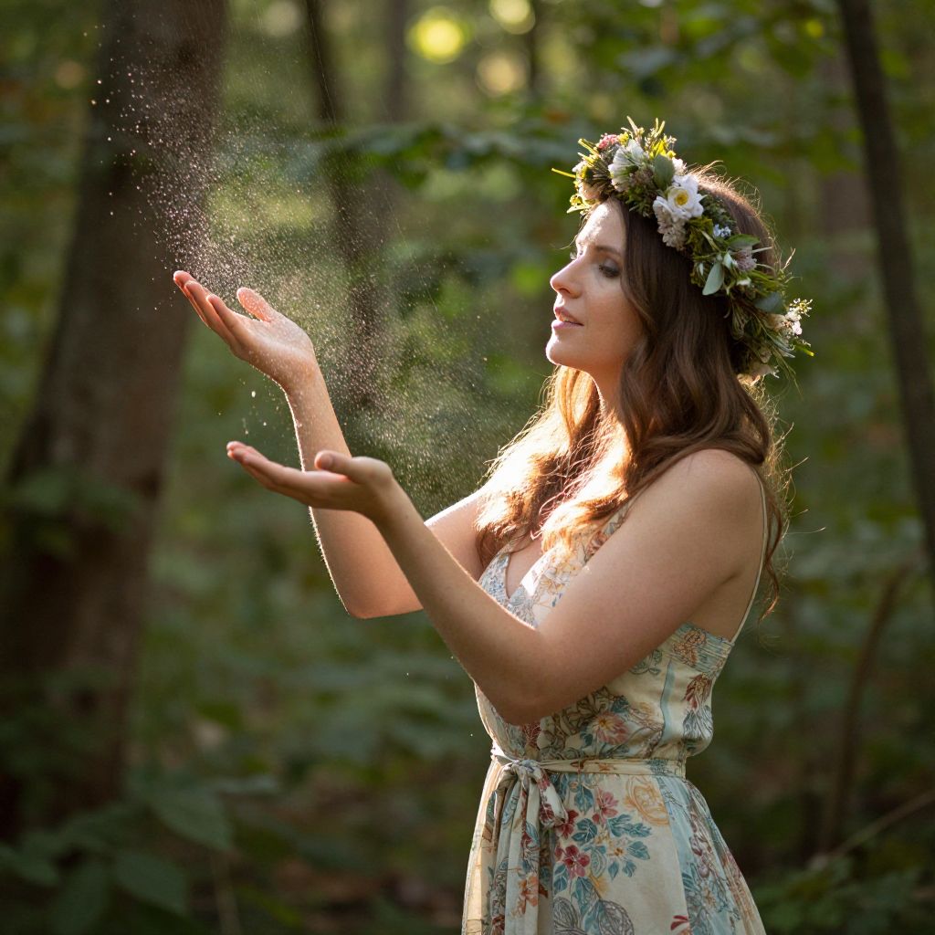 A woman adorned with a floral crown and dress stands in a sun-dappled forest, her outstretched hand releasing a cascade of shimmering sparks into the air, defying the ordinary laws of nature.