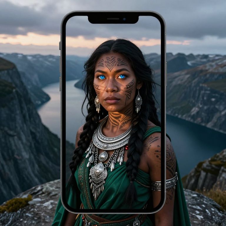 Imagine an iPhone portrait of a Pacific Islander sorceress with mesmerizing blue eyes. Adorned in intricate silver jewelry and cloaked in emerald fabric, she stands on a precipice overlooking a misty fjord at twilight. From a worm's-eye perspective, the viewer is immersed in her mystical realm as soft ambient light casts dramatic shadows across her face, revealing ancient runes etched upon her skin. Her enigmatic gaze exudes wisdom, creating an emotional spectrum of intrigue and awe. This photorealistic portrait seamlessly blends high-definition digital artistry with cinematic lighting techniques, transporting viewers to a world where ancient magic intertwines with modern technology.