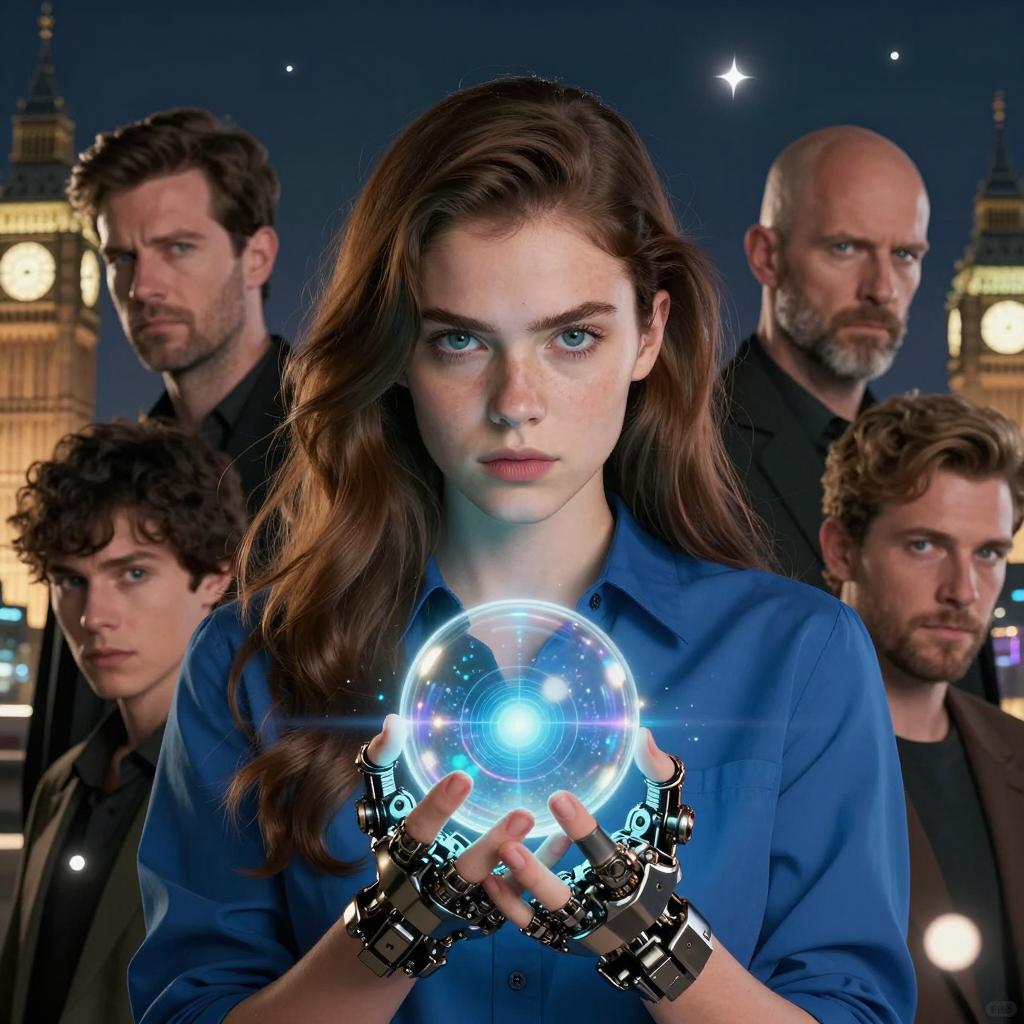 Four young adults standing in front of a brick building, with the central man holding a glowing energy sphere emitting lightning bolts. The group includes a Caucasian man with wavy brown hair in a grey t-shirt and blue denim shirt, an Asian woman wearing a pink tank top and blue jeans, an Asian man with glasses in a blue shirt, and a man in a black t-shirt and pants. All hold futuristic guns, portraying a serious and intense mood.