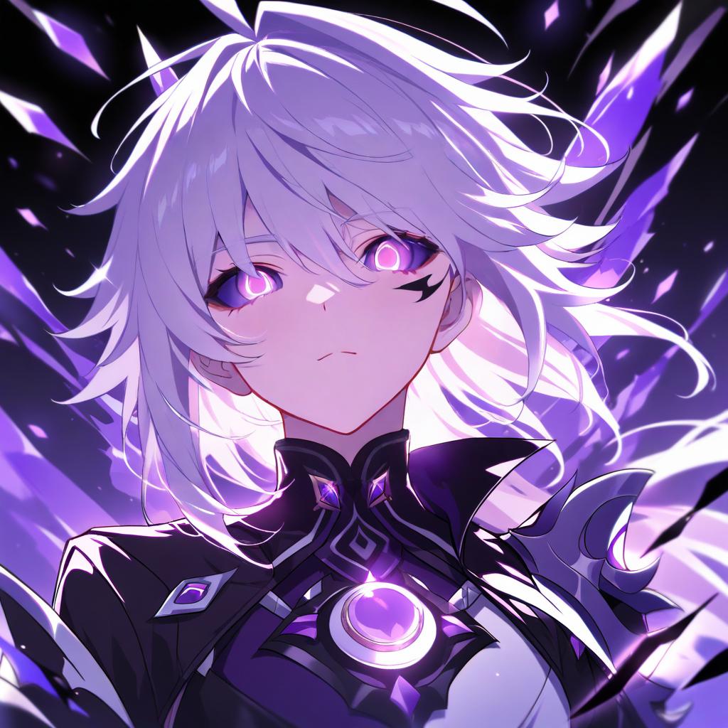 Digital anime-style portrait of a male character with brown short hair and red eyes. The character is wearing a white collared shirt, a black-and-white striped tie, and black gloves. He has a serious expression and is shown with hair partially covering his eyes, set against a dark background with subtle glowing effects.