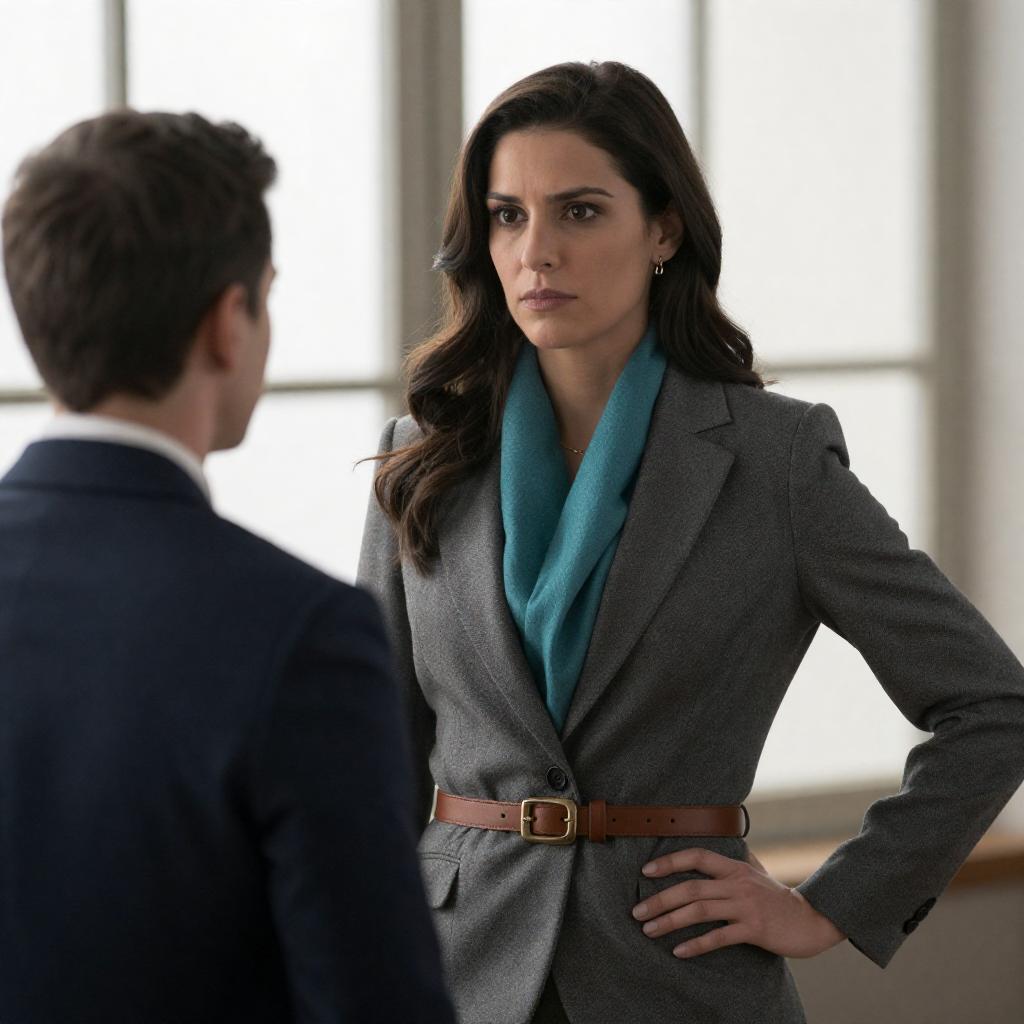 Photograph of a serious woman with long dark brown hair, wearing a gray blazer, teal scarf, and brown belt, standing with one hand on her hip, facing a man in a dark suit with short brown hair, who is looking up at her. Background features blurred, illuminated windows.
