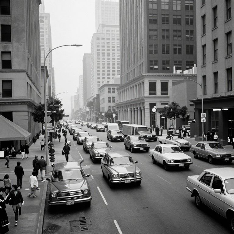 Black-and-white photograph of a busy urban street with multiple cars, pedestrians, and tall buildings. City traffic and architecture dominate the scene.