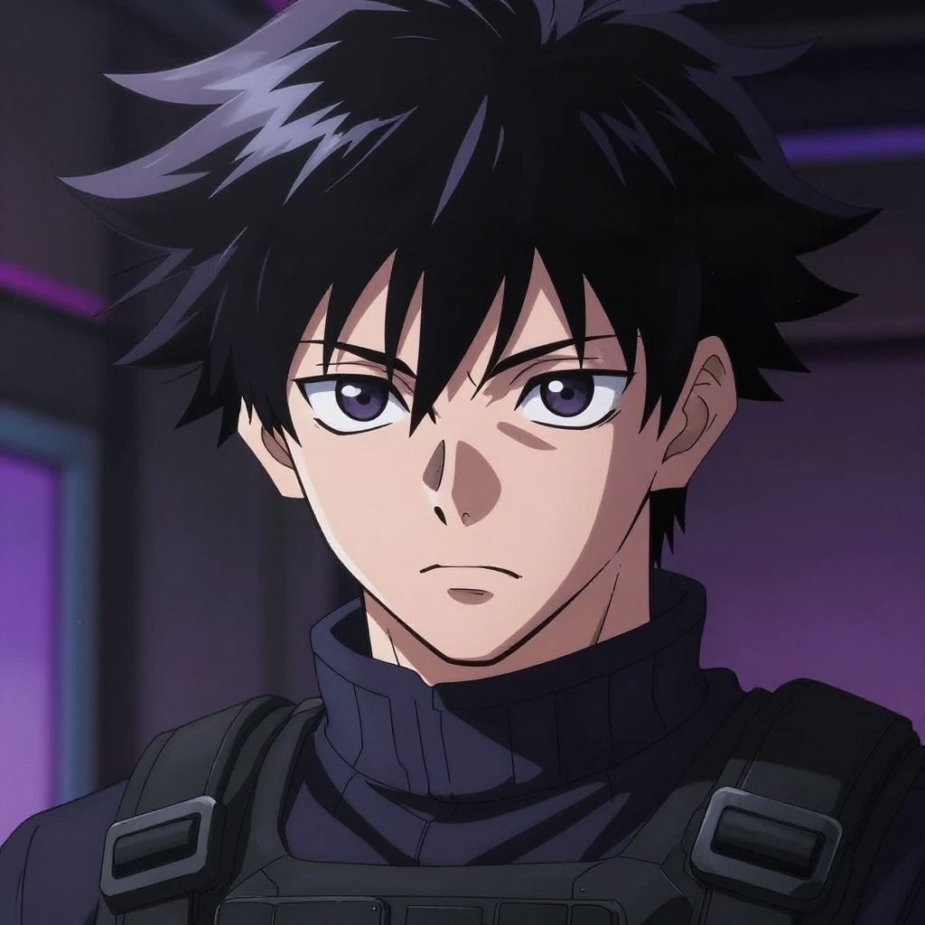 Close-up of Toji Fushiguro appearance, detailed anime style, rugged expression, short messy hair with silver streaks, dark tactical outfit, ambient neon lighting, fierce gaze