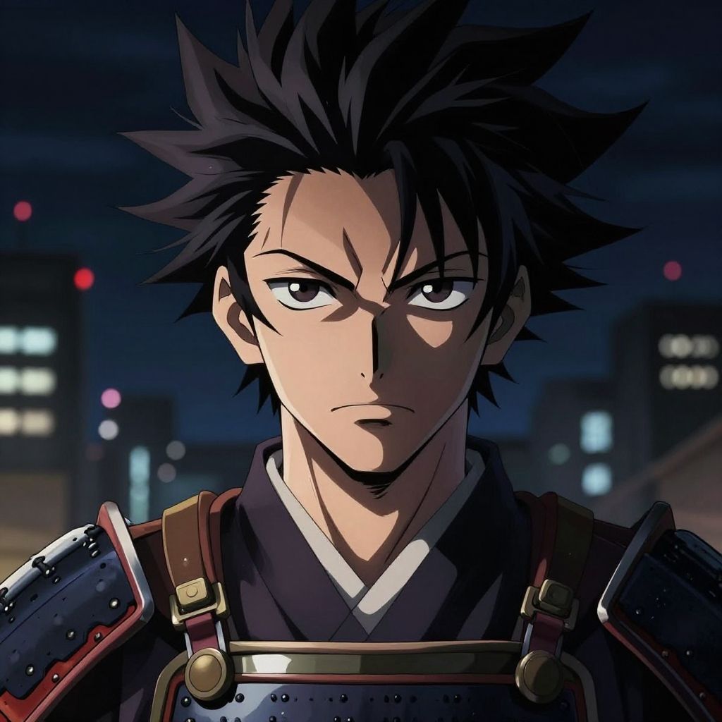 This digital anime-style illustration features a close-up of a young man with spiky, black hair and intense, blue eyes. He has a serious, determined expression on his pale face. He wears a high-collared, black turtleneck with black tactical gear straps over his shoulders. The background is a blurred mix of dark purples and blues, suggesting an indoor setting with dim lighting. The artwork utilizes sharp lines and vibrant colors typical of modern anime aesthetics.
