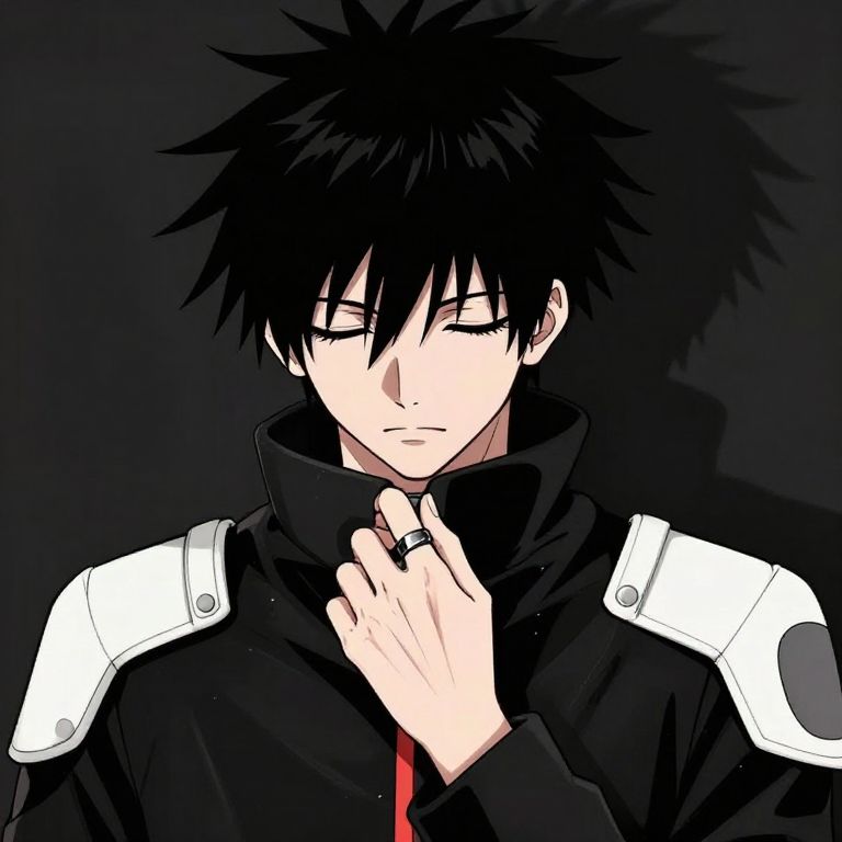 Anime-style digital drawing of a serious, black-haired young man with spiky hair, wearing a black turtleneck and tactical vest, set against a