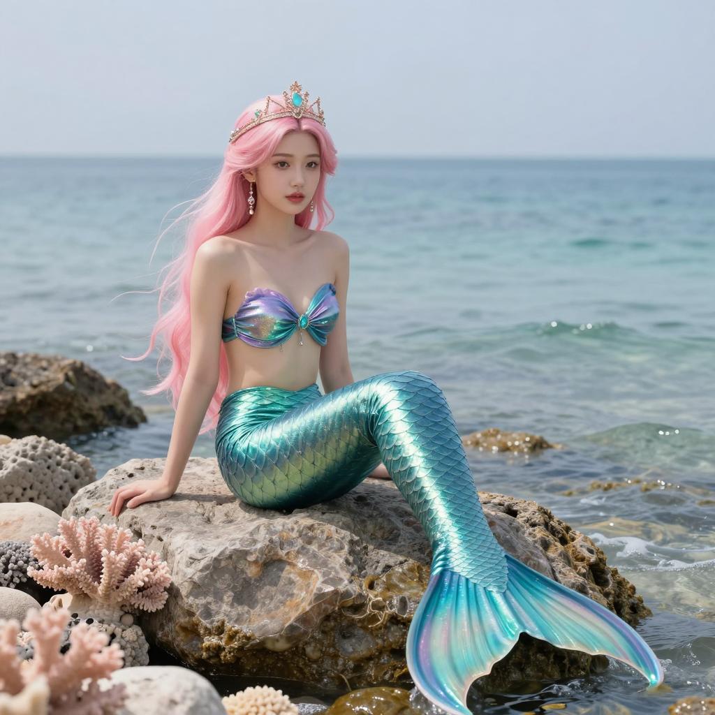 A stunning mermaid with long pink hair and a turquoise tail sits gracefully on a rock by the calm sea. She wears an ornate crown and a matching shimmering top, surrounded by soft pastel-colored coral and smooth rocks under bright daylight.