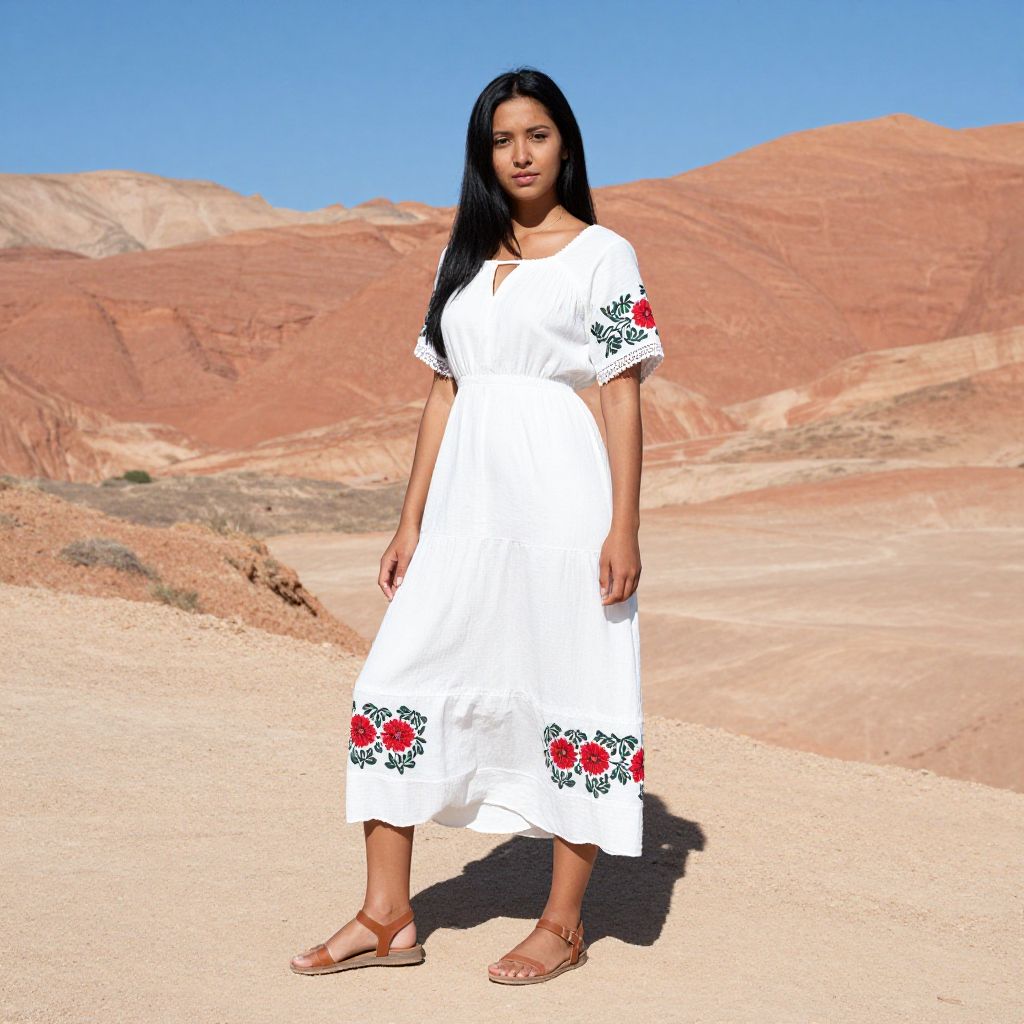 Photograph of a young woman standing in a desert landscape with red rock formations in the background. She has long black hair, medium brown skin, and is wearing a white, ankle-length dress with red and green floral embroidery on the sleeves and hem. She's also wearing brown sandals. The bright blue sky contrasts with the red and beige desert terrain. She looks confident and relaxed.