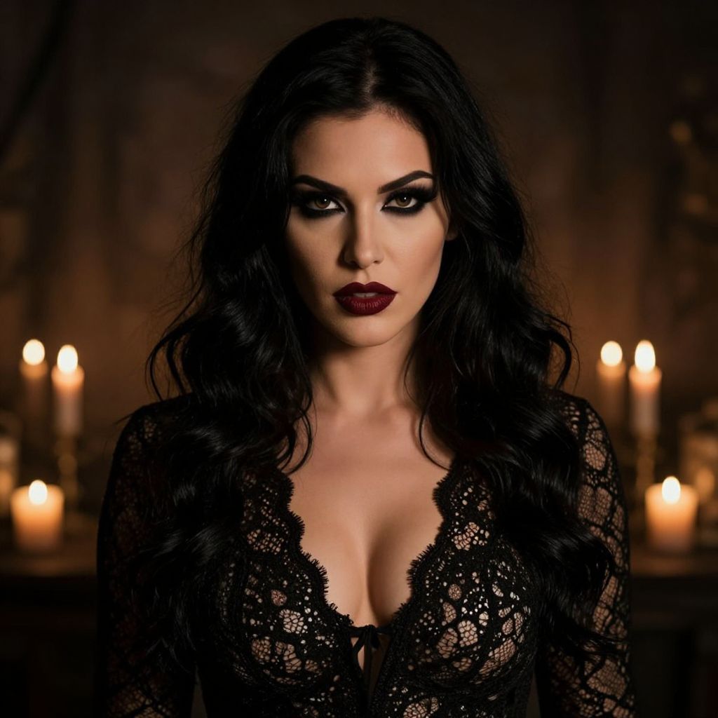 Photograph of a mysterious woman with long, black, wavy hair, wearing a low-cut, black lace top that reveals some cleavage. She has dark, dramatic makeup and deep red lipstick. The background is dimly lit with warm, glowing candles, creating a spooky, gothic atmosphere. The light focuses on her face, making her expression intense and captivating.