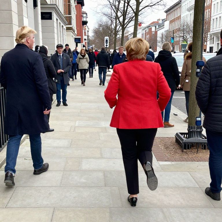 Wide-Angle Perspective Angela merkel running away from Donald trump on a crowded sidewalk. Photorealistic shot with iPhone,