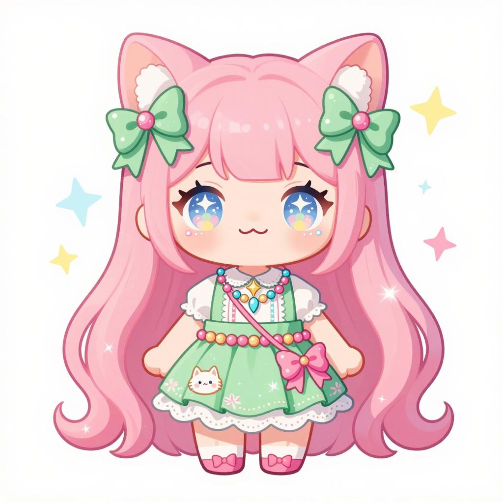 Chromolithograph a full body portrait of a cat girl, [pink] hair, wearing a [green] skirt, cute, zodiac, cat ears, kawaii, decora fashion, bows, lace, colourful, harajuku, chunky jewellery, sparkly makeup, glitter, sparkles, beautiful, fantasy, adorable,