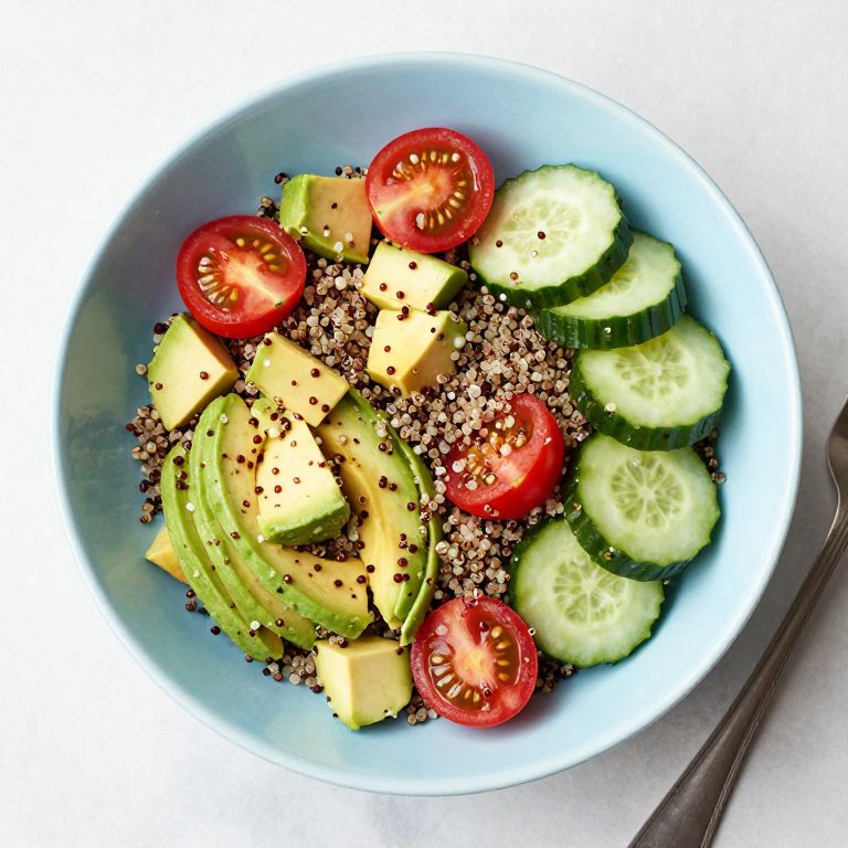 Vibrant quinoa salad served in a light blue bowl, featuring diced avocado, cherry tomatoes, and cucumber slices artfully mixed together, ready to be enjoyed as a refreshing side dish.