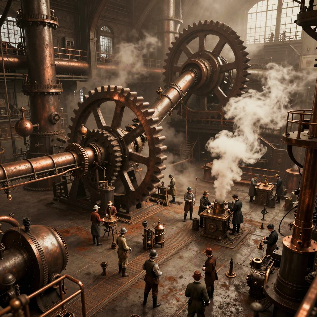 Steampunk battlemaps showing sprawling factory interiors filled with massive gears, conveyor belts, steam vents, rusty metal floors, copper walkways, Victorian engineers working, dramatic steam clouds rising, warm sepia tones