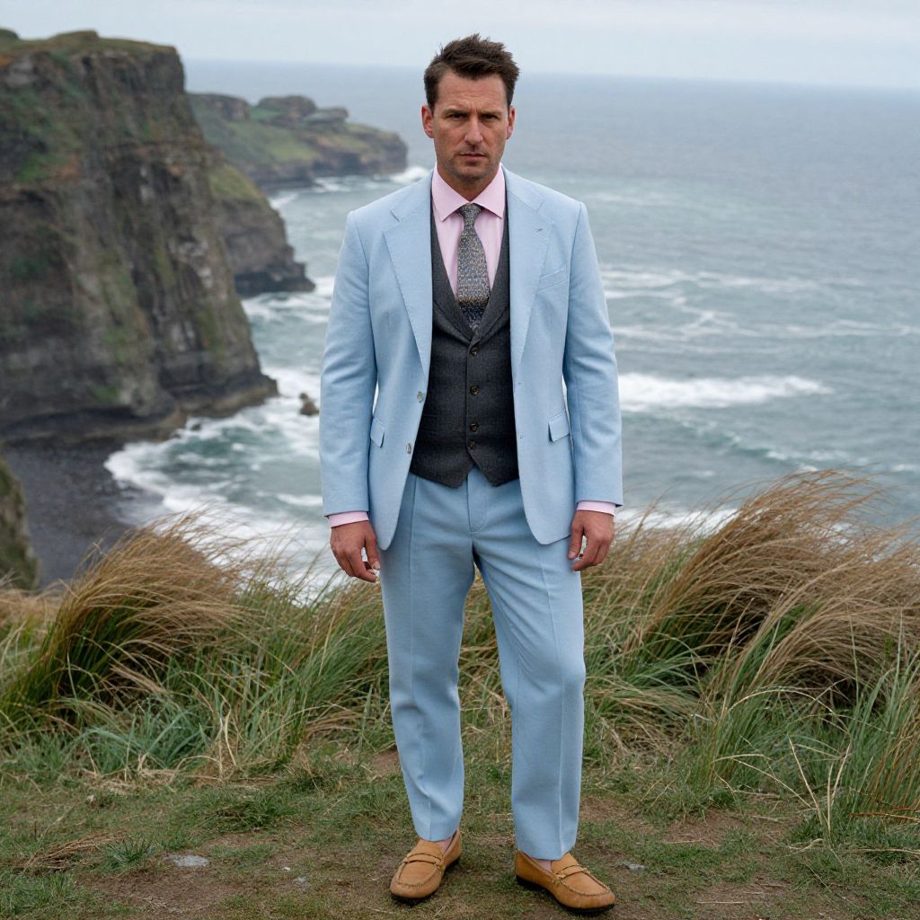 A man, light blue suit jacket, charcoal grey waistcoat, pale pink dress shirt, patterned silk tie, tan leather loafers, coastal cliffs, wind-swept grasses, ocean waves crashing below, 3M analog film stock, confident expression. Man has masculine face and piercing eyes