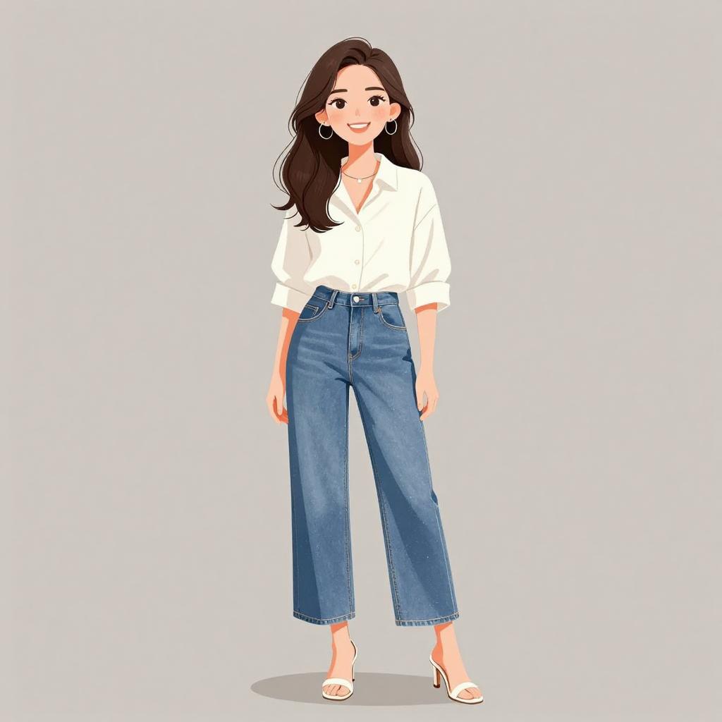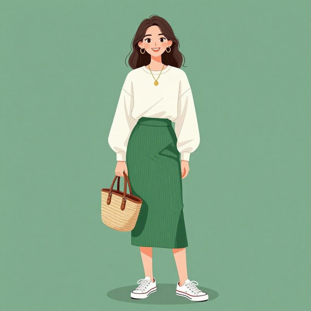 Woman with pretty face and pretty hair. smiling Woman, casual chic, white crew neck sweatshirt, long sleeves, tucked into high-waisted ribbed skirt in forest green, midi length, straw handbag with leather handle, white low-top sneakers, gold pendant necklace, hoop earrings, hair styled down, solid color backdrop --sref 1467