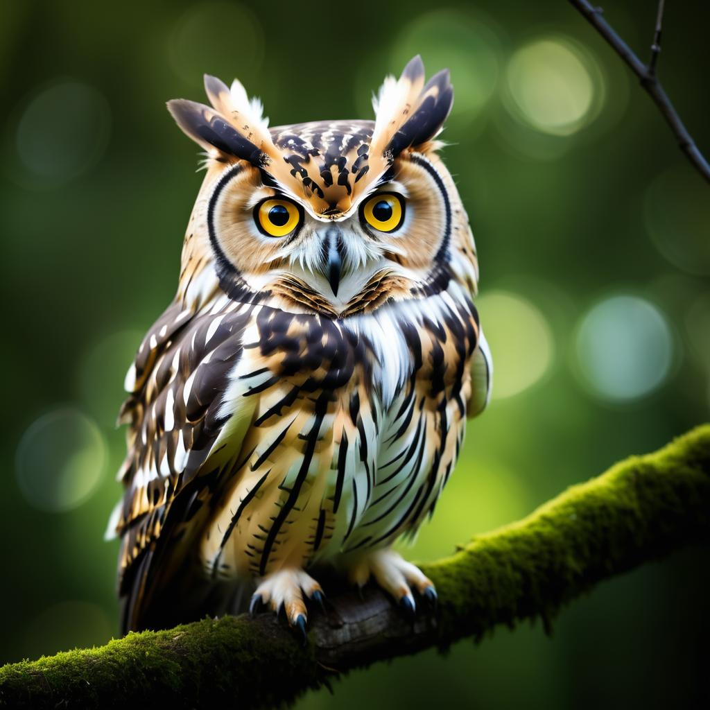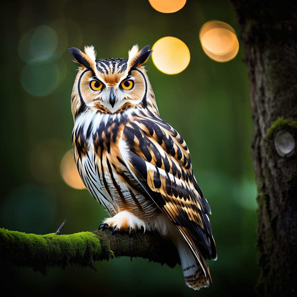 Close-up of a brown and white owl with bright yellow eyes perched on a moss-covered branch in a forest. The owl's feathers display intricate patterns with black and orange streaks. The background is blurred green foliage with circular bokeh lights.