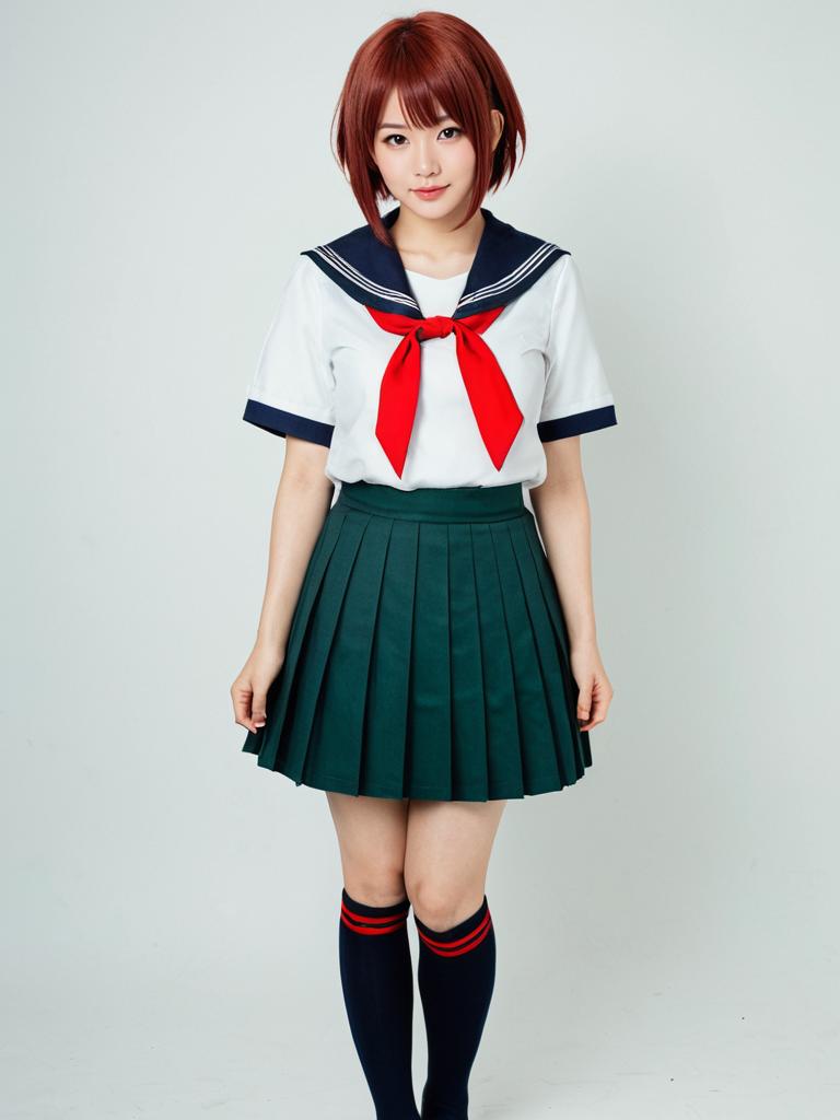 Photo-realistic cosplay photo of person in mutsuki kai ni (kancolle) costume. Full body. Standing. Full length. 1girl, red eyes, brown eyes, short hair, brown hair, gradient hair, red hair, serafuku, serafuku, green skirt, pleated skirt, green sailor collar, crescent pin, red neckerchief