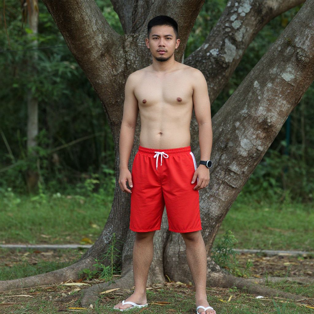 Chub rub shorts costume, 1boy, male focus, solo, topless male, realistic, facial hair, shorts, outdoors, wristwatch, full body, watch, asian, navel, looking at viewer, sandals, black hair, tree, standing, red shorts