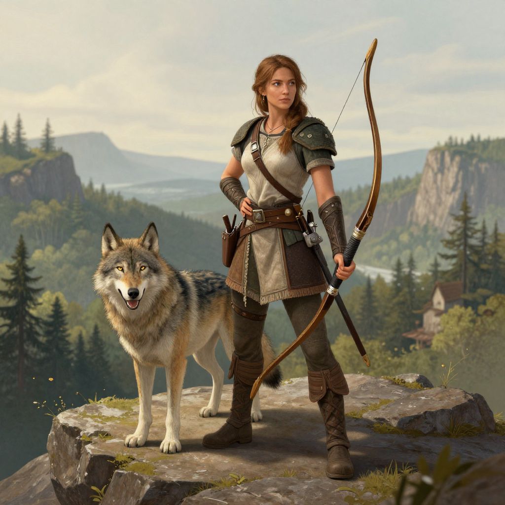 Dnd character drawing maker presenting a versatile ranger with a bow, accompanied by a loyal wolf companion, standing on a rocky cliff with lush forest below, natural earthy tones, intricate costume details, dynamic outdoor fantasy scene