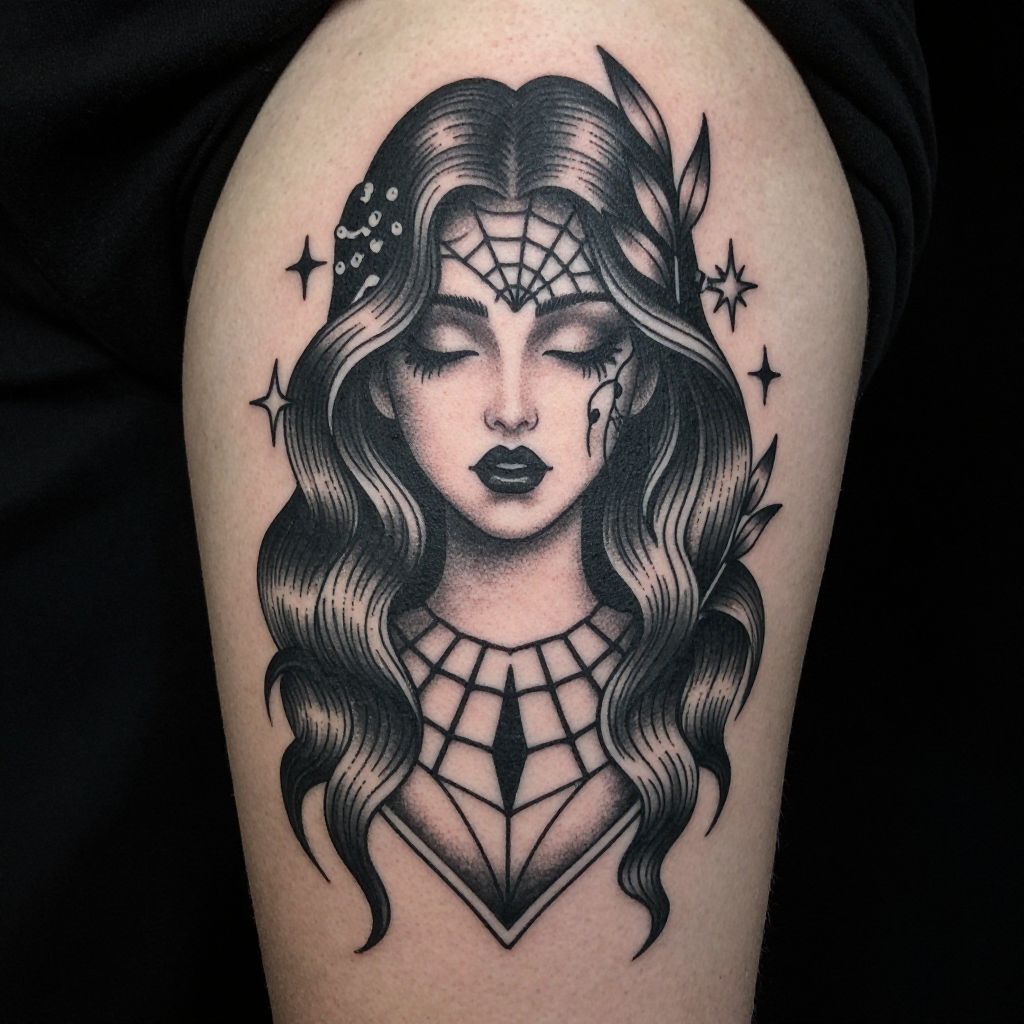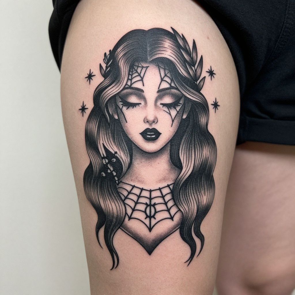 Black and gray tattoo of a serene, long-haired woman with spiderweb forehead, star accents, and spiderweb necklace on thigh.