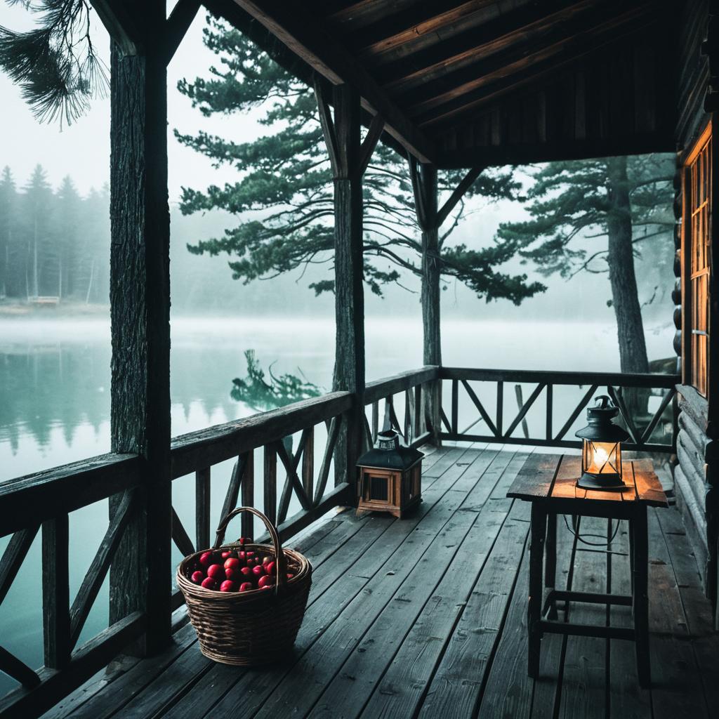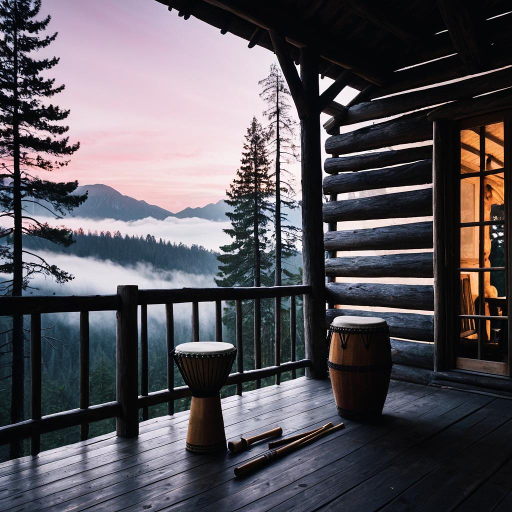 A rustic wooden porch of a rustic treehouse, lit by glowing lantern light, featuring a silhouette of a banjo and a set of vintage drums, with a backdrop of ancient pine forest with subtle mist rising, creating an ethereal vibe, dreamlike and magical ambiance