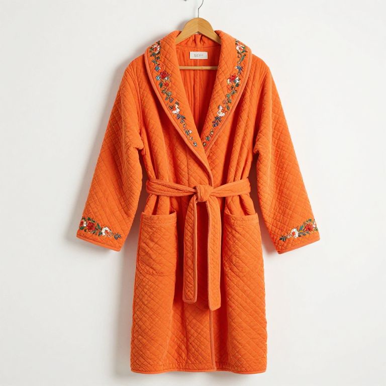 Vibrant orange quilted housecoat robe from the 1960s, featuring intricate floral embroidery on the collar and cuffs, hangs neatly on a wooden hanger against a plain white background.