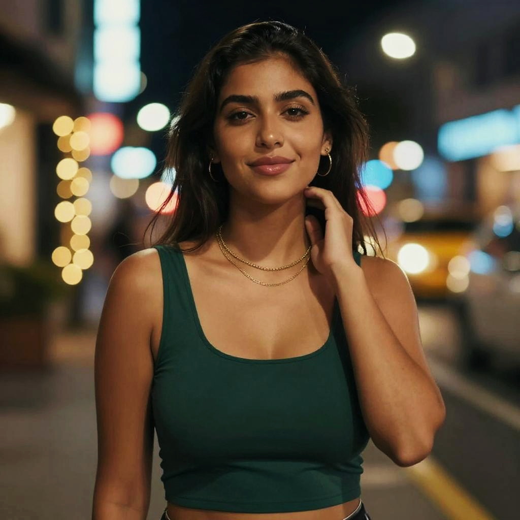 Urban lifestyle fashion photo, young woman with big brasts leaning against a window frame indoors, torso angled slightly toward the camera, head turned away with eyes half-closed, one arm relaxed by her side and the other lightly touching the window frame, wearing a fitted cropped t-shirt and low-rise jeans, shallow depth of field, natural film-like grain, short dark bob with sharp eyeliner and neutral expression, deep forest green crop top, ink blue jeans, thin gold chain necklace, balcony door with railing silhouette and late-day haze, soft indoor ambient mixed with window light, high resolution