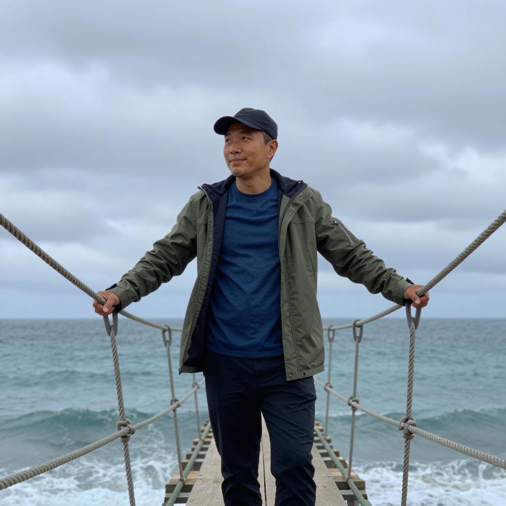 Man standing on a rope bridge over the ocean, hands on ropes. Wearing a green jacket, blue shirt, dark pants, and a cap. Cloudy sky in background. Ropes arching on either side. Ocean below, waves visible. Man looking forward, slight smile.